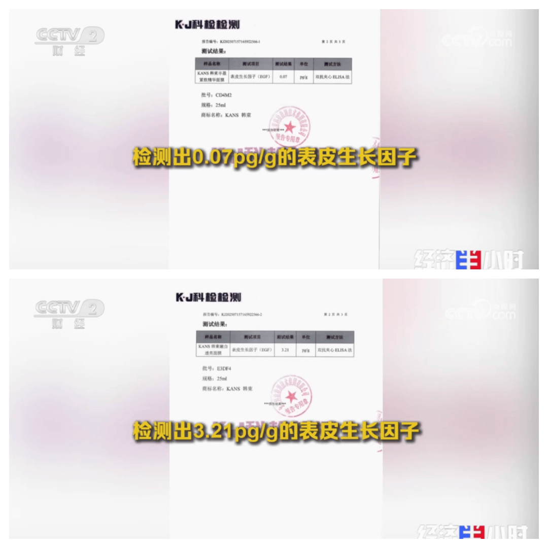 央视记者对韩束旗下两款面膜产品,送到有资质的第三方机构检测,结果显示,韩束丰盈紧致精华面膜、韩束嫩白透亮面膜中,均检出了法律明令禁止在化妆品中添加的表皮生长因子(EGF),检出含量分别为0.07pg/g和3.21pg/g。