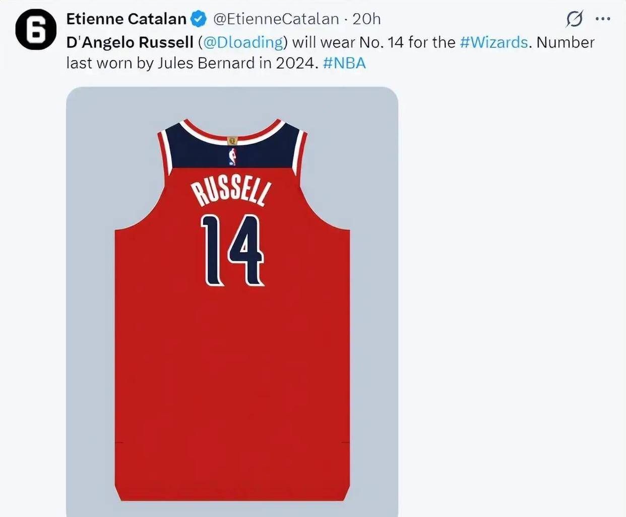 一天之前,有个球衣号码博主还在讨论他的奇才14号球衣上一位穿14号的是伯纳德。几小时后,消息直接翻车:根据独行侠记者的报道,丹吉洛-拉塞尔不会回华盛顿奇才报到,他正在跟奇才队谈买断的事宜。